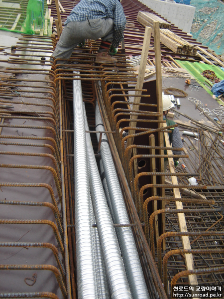 박스거더의 프리스트레스(Prestress)의 도입은 포스트텐션(Post-tensioning) 방법을 사용하며 위의 개요도 및 아래 사진과 같이 박스거더 단면내부에 쉬스관을 배치하고 콘크리트를 타설 후 쉬스관 안에 강연선(텐던, Tendon)을 넣고 정착구에서 유압잭을 이용하여 인장함으로써 거더 단면에 프리스트레스를 도입합니다.