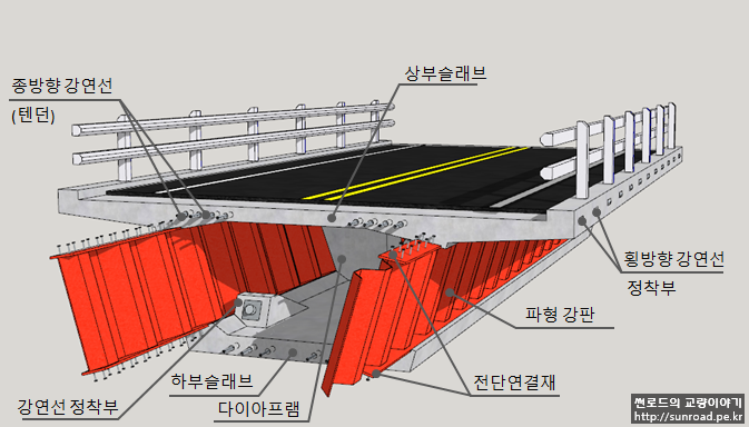 이러한 복합 교량은 1980년대 프랑스에서 시작되어 유럽, 일본에 적용되어 왔으며 국내에는 대략 2000년대 초반부터 적용되기 시작하였습니다. 복부 트러스 PSC 박스 거더교는 PCT (Prestressed Composite Truss) 거더교란 이름으로 국내에 많이 시공되고 있으며, 순창-운암 4공구 마암교에 도로교로는 최초로 적용되었습니다. 파형강판 웹 PSC 박스 거더교는 낙동강을 횡단하는 선산-도계 도로 건설공사의 일선대교(개통 시 선산대교로 변경)에 국내 처음으로 적용되었습니다.