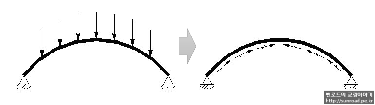 형태가 곡선이며 수평으로 지지되어 있는 아치 구조물은 아래 그림과 같이 구조물에 가해지는 외력을 부재의 압축력으로 저항하게 되며 이를 아치효과(Arching Effect)라고 합니다. 휘어진 보를 단순보와 같이 지지시킨 보와 역학적으로 다른 점은 수평방향 구속력에 있습니다. 수평반력은 휘어진 아치의 부재에 휨모멘트와 함께 축력을 주게 되는데, 수평반력으로 인해 발생하는 휨모멘트는 하중에 의해 발생하는 휨모멘트를 없애도록 거동하므로 이상적인 아치부재에서는 축력(압축력)만 발생하게 됩니다.