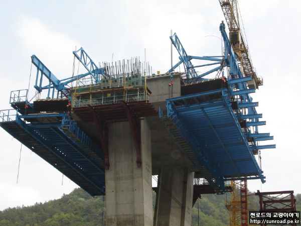지보공으로 트러스 구조를 설치하고 그위에 거푸집을 설치, 주두부를 시공하였습니다.