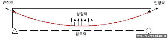 아래 그림과 같이 콘크리트 속에 강선을 넣고 강력하게 잡아당겨서 고정시키면, 콘크리트에 압축응력이 작용하게 되고 강선을 그림과 같이 넣었을 경우 강선 인장시 상향력이 생기게 됩니다.
