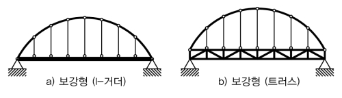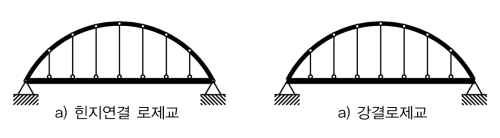 로제교는 <그림 27>과 같이 휨강성을 가지는 아치리브와 보강거더를 양단에서 연결하고 아치리브와 보강거더간을 양단힌지의 수직재로 연결한 구조이며, 랭거교와 타이드아치교의 중간적인 성질을 갖는다. 아치리브의 강성이 크기 때문에 랭거교에 비해 수직재 간격을 늘릴수 있으며 아치리브와 보강형의 접속부 연결이 용이하다.