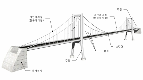 현수교란 주탑(Tower) 및 앵커리지(Anchorage)로 주케이블(Main Cable)을 지지하고 이 케이블에 행어(Suspender또는Hanger)를 매달아 보강형(Stiffening Girder)을 지지하는 교량형식을 말합니다.
