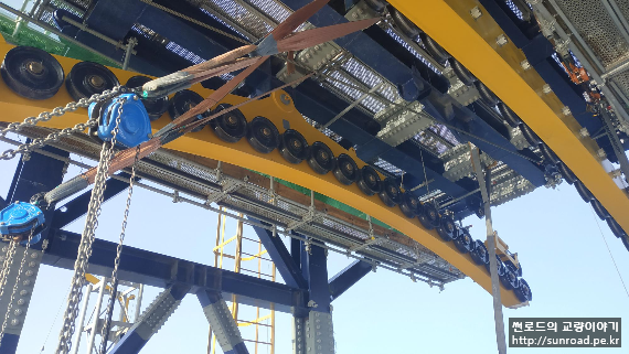 현재 중앙경간 Catwalk 로프 가설을 위해 직경 25mm Suspender Rope를 가설하고 있습니다. 중앙경간 구간은 대형 컨테이너 선박이 하루에도 여러대가 지나가는 등 선박통행량이 많은 지역이라 항로 영향을 최소화하기 위해 Suspender 공법을 적용하였습니다. Catwalk 규모가 크다보니 프리행공법 적용시 Hauling System이 과도하게 커지는 점도 Suspender 적용의 이유이기도 합니다. 측경간 측 Catwalk Rope는 선박통행이 없으므로 Suspender 없이 설치하고 있습니다.