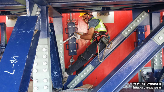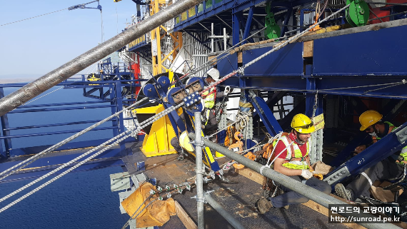 Suspender Rope는 Leg당 4개로 계획되었고 현재 1차 suspender rope (leg당 2개) 설치가 완료되었으며 2차 Suspender Rope를 설치중입니다.