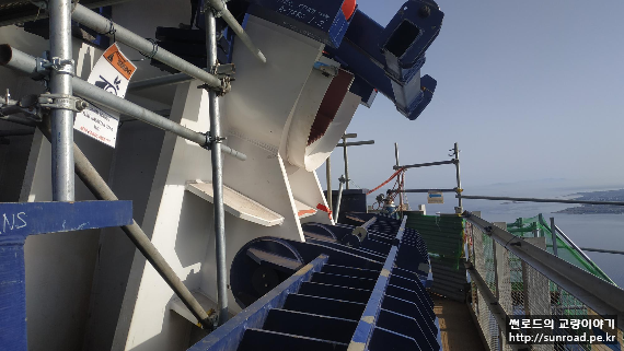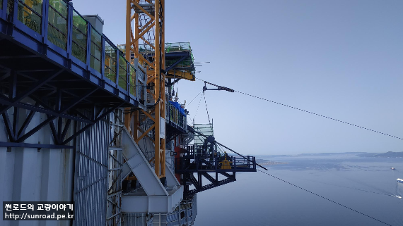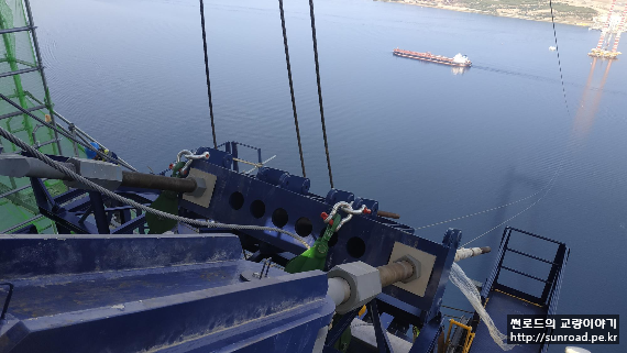 현재 중앙경간 Catwalk 로프 가설을 위해 직경 25mm Suspender Rope를 가설하고 있습니다. 중앙경간 구간은 대형 컨테이너 선박이 하루에도 여러대가 지나가는 등 선박통행량이 많은 지역이라 항로 영향을 최소화하기 위해 Suspender 공법을 적용하였습니다. Catwalk 규모가 크다보니 프리행공법 적용시 Hauling System이 과도하게 커지는 점도 Suspender 적용의 이유이기도 합니다. 측경간 측 Catwalk Rope는 선박통행이 없으므로 Suspender 없이 설치하고 있습니다.