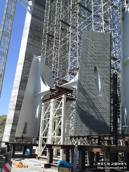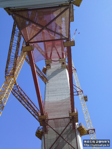 2014년 3월 콘크리트 주탑을 시공중이였으며, 사장케이블 정착구 하단까지는 Slip Form공법, 그 이후는 ACS (Auto Climbing System) Form 으로 시공하였습니다. 아래는 Slip Form 시공 전경입니다. 주탑 가로보는 Full Staging으로 시공하고 있네요...