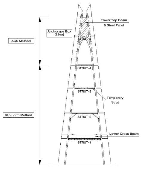 콘크리트 주탑은 사장케이블 정착구까지는 Slip form을 정착구 부터는 ACS를 적용하여 시공되었습니다.