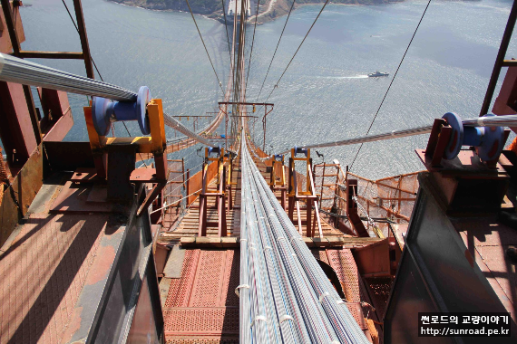 중앙경간 데크 가설 및 사장케이블 가설, 그리고 현수케이블 가설을 하고 있습니다.