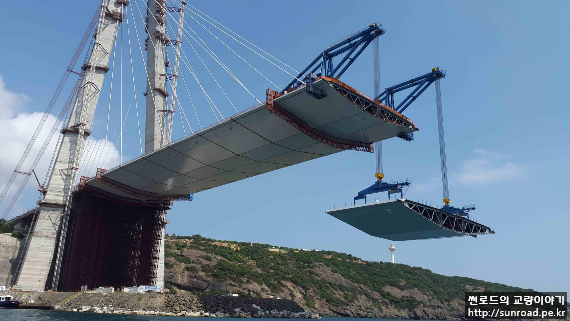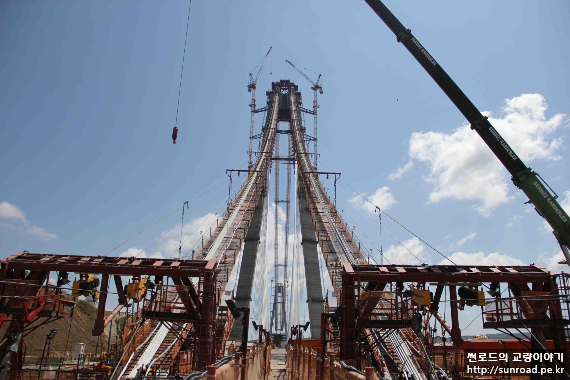 중앙경간 데크 가설 및 사장케이블 가설, 그리고 현수케이블 가설을 하고 있습니다.