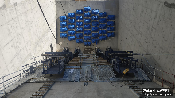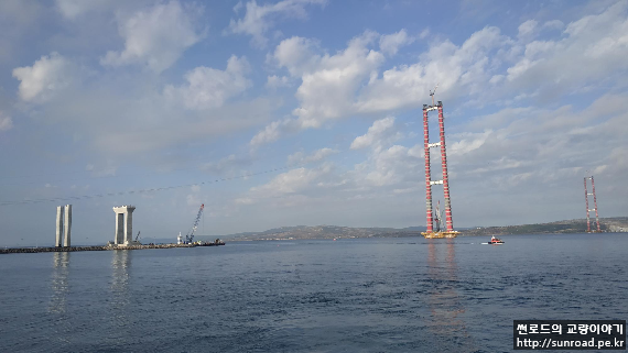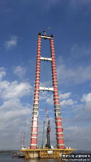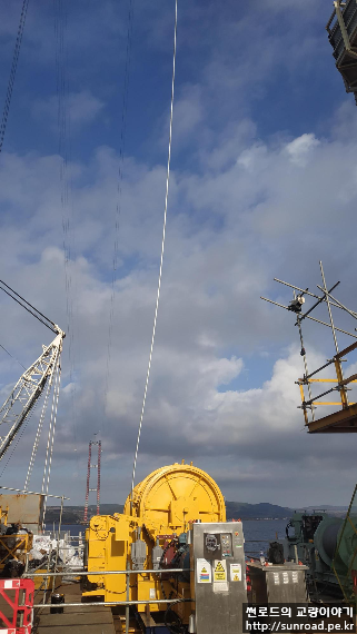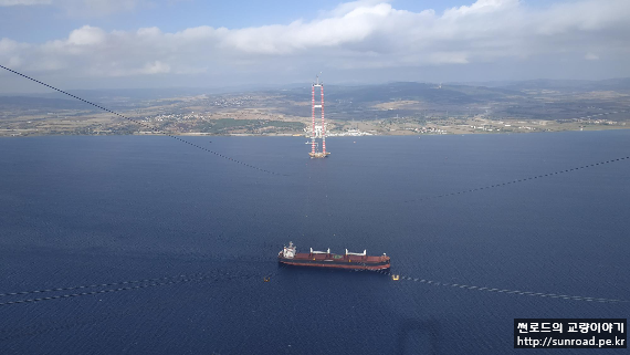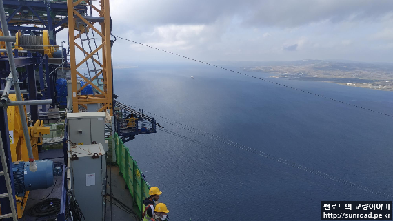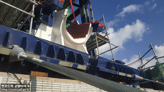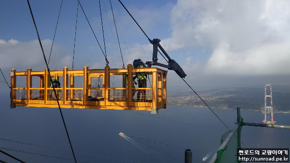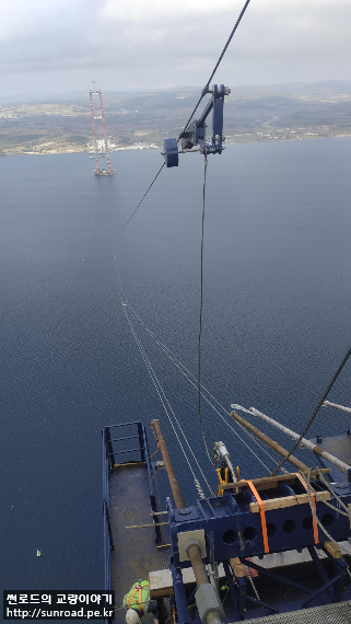 중앙경간 Catwalk은 아시아 측 주탑 하단에 설치된 Unreeler(아래 좌측사진)에서 탑정으로 윈치를 이용 끌어올리고(아래우측사진), 이를 Rope Carrier에 연결하여 유럽측 주탑으로 끌고가 정착하는 방식으로 시공중입니다.