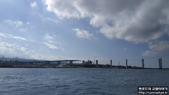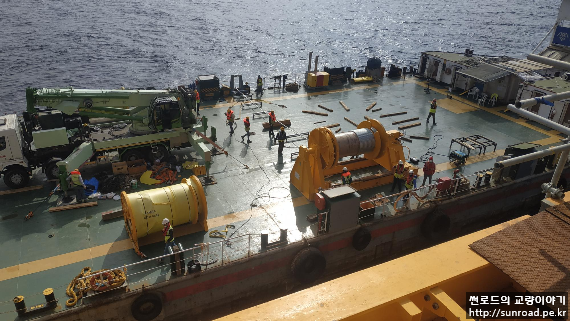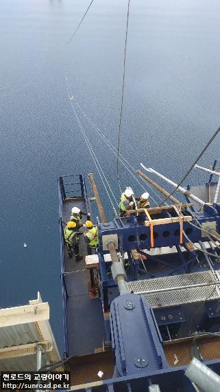 측경간 catwalk 가설은 Side Span Pier 위치에서 주탑까지 바지선을 이용하여 Rope를 해저바닥에 놓으며 예인 한 후 Winch를 이용, 탑정으로 끌어올려 설치합니다.