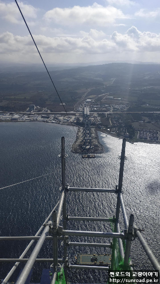10월 현재 Temporary Hauling Rope, Suspender Rope가설이 완료되었고, Catwalk Rope를 가설하고 있습니다. 다른 Rope들은 멀리서 잘 안보이는데 Catwalk Rope는 워낙 두꺼워서인지 멀리서도 잘 보입니다.