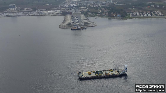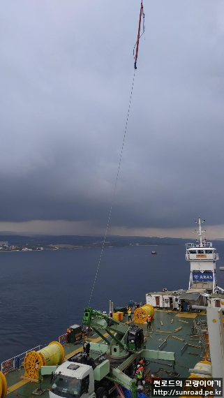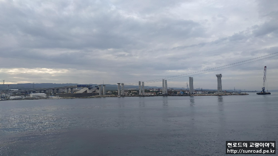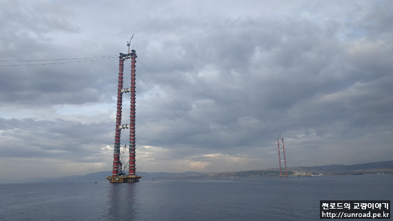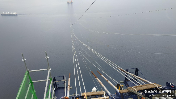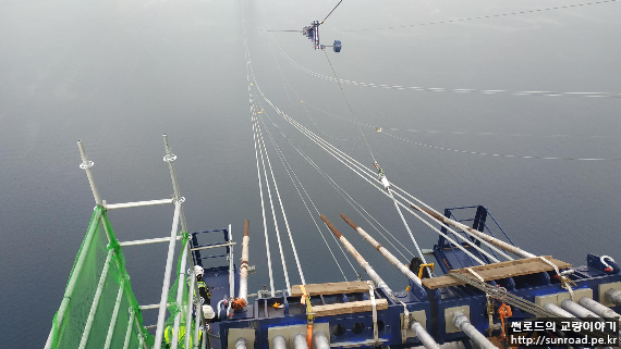 이전 post에서도 이야기 했듯이 중앙경간 catwalk은 hauling syste을 이용한 서스펜더공법을, 측경간은 바지선을 이용, 측경간측에서 rope를 끌고와서 주탑으로 끌어올려 설치하는 방법으로 시공되고 있습니다.