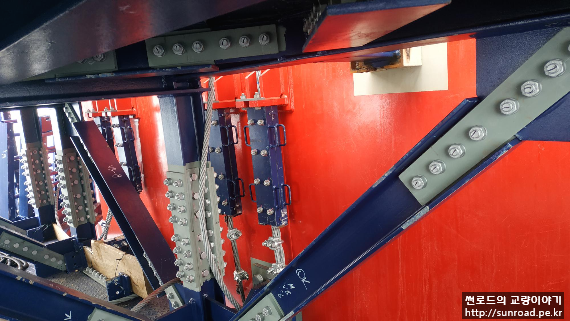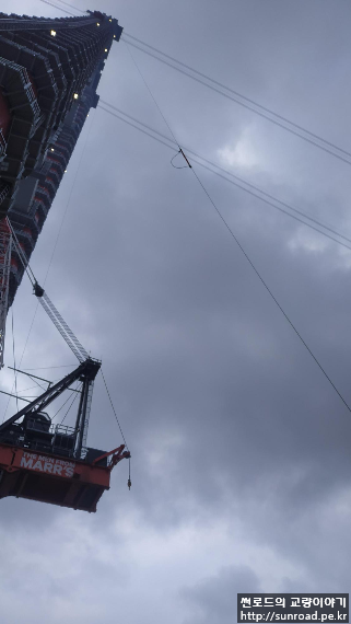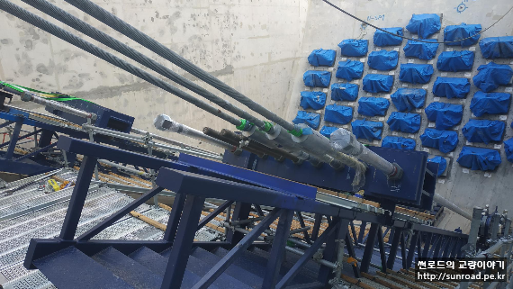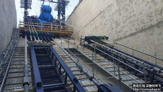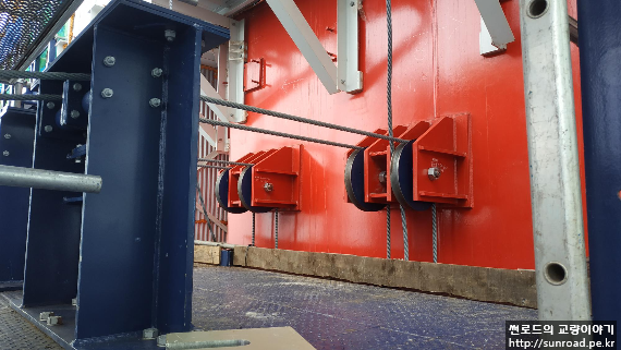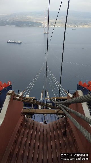 Rope Carrier가 catwalk rope를 달고 막 출발했습니다. Hauling 속도는 최대 10m/min으로 건너편 주탑까지 가려면 4시간 이상 소요된다.Catwalk rope가 첫번째 suspender에 안착 하였다.Catwalk rope unreeler는 주탑 하단부에 위치하고 있다.