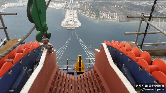 Rope Carrier가 catwalk rope를 달고 막 출발했습니다. Hauling 속도는 최대 10m/min으로 건너편 주탑까지 가려면 4시간 이상 소요된다.Catwalk rope가 첫번째 suspender에 안착 하였다.Catwalk rope unreeler는 주탑 하단부에 위치하고 있다.
