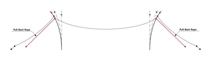 메인 케이블 가설중에는 타워 새들부에서 중앙경간 및 측경간 케이블의 수평력의 차이가 발생하는데 이러한 불균형 힘에 의해 새들에서 케이블이 미끄럼(Slip)이 발생할 수 있습니다. Slip이 발생하게 되면 목표한 메인케이블 및 교량의 형상에 도달할 수 없으므로 메인케이블 가설 중 수평 분력의 차를 최소화 하여 Slip이 발생하지 않도록 Saddle 위치의 조정이 필요합니다. Saddle 위치 조정을 위해 타워를 로프로 당기거나(Pull Back) 타워에서 타워새들 위치를 조정(Set back)하게 되는데 보통 강성이 상대적으로 작은 강재주탑의 경우 Pull back을, 강성이 큰 콘크리트 주탑은 Set back을 적용합니다.