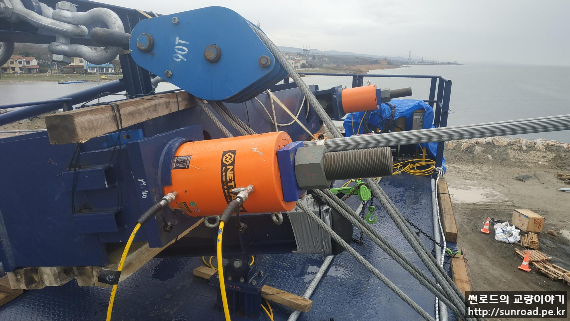 Pull back strand는 메인케이블 스트랜드와 같은 규격 (Φ5.75mm wire x 127)을 이용하였고, 주탑 Leg당 2개씩(총 8개)을 설치후 긴장하였습니다. Strand 길이는 815m, Strand 1개당 무게는 21ton입니다.