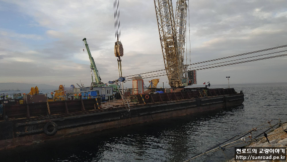 Pull back strand는 측경간 Catwalk rope와 같이 주탑측 바지선 위에서 타워윈치로 인양하여 주탑의 Pull back anchorage에 정착후 부탑쪽으로 바지선으로 이동하여 부탑 기초위 Anchorage에 정착하는 순서로 설치하였으며, 설치후 유압잭으로 장력을 도입하여 미리 계산된 Pull back양을 맞추었습니다.