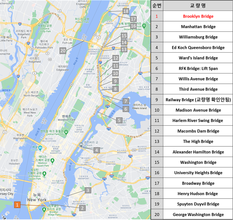 뉴욕의 교량 첫번째로 뉴욕의 상징 교량인 Brooklyn Bridge 올려봅니다. 그동안 포스팅 간격을 볼때 아래 리스트의 20개를 다올리려면.. 아마 몇년은 걸리지 않을까 싶네요...