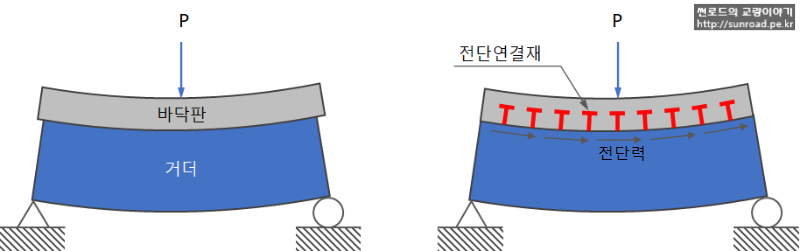 교량슬래브(바닥판)와 거더와이 일체화 여부로 합성구조와 비합성 구조로 분류하기도 합니다. 거더와 바닥판을 일체화 시킨 합성구조의 경우 거더의 강성에 바닥판의 강성을 추가 고려하여 교량전체 강성이 증가하게 되므로 비합성 구조에 비해 거더 단면을 줄일 수 있습니다. 비합성 구조의 경우 바닥판은 교량전체 강성에 기여하지 않고 하중으로만 작용하는 것으로 간주합니다.