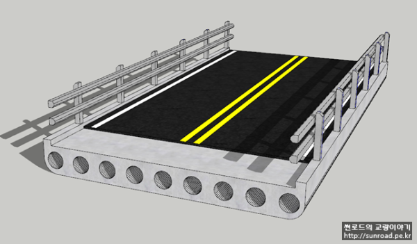 슬래브교는 지간이 늘어날수록 자중 증가로 인해 효율이 많이 떨어지는데, 이를 극복하기 위해 슬래브 내부에 빈 공간을 만들어 자중을 줄이거나 PSC 강재를 도입하기도 합니다. 이러한 슬래브의 구조에 따라 슬래브교(Solid Slab Bridge), 중공 슬래브교(Hallow Slab Bridge), PSC 슬래브교(Preestressed Concreste Slab Bridge) 등으로 구분할 수 있습니다. 중공슬래브에 PSC 강재를 도입하기도 합니다(PSC 중공슬래브교)