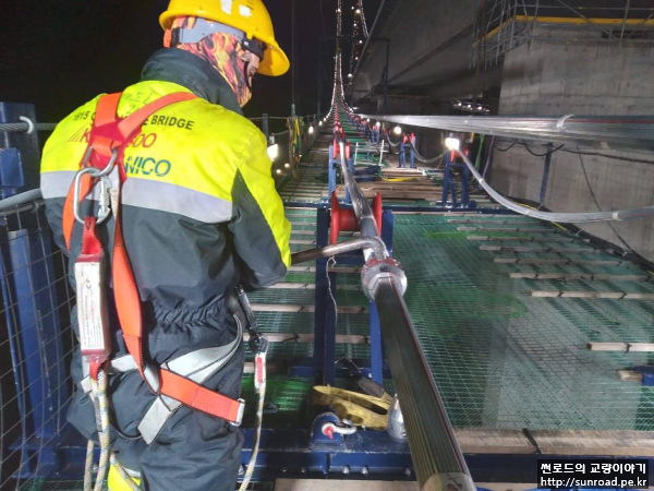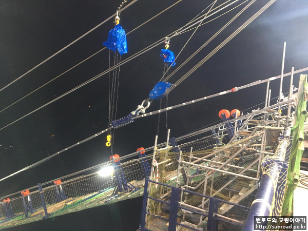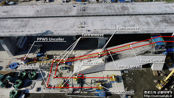 PPWS 인출완료후, 케이블 정형 및 새들에 설치를 위해 케이블 클램프 및 Pulley를 설치하고 윈치를 이용하여 케이블을 가인장(Slacking) 해줍니다. PPWS를 가인장을 하여 롤러 위에 있는 Strand가 떠오르면 Strand를 소정의 위치로 이동합니다.