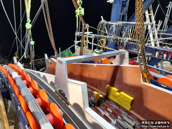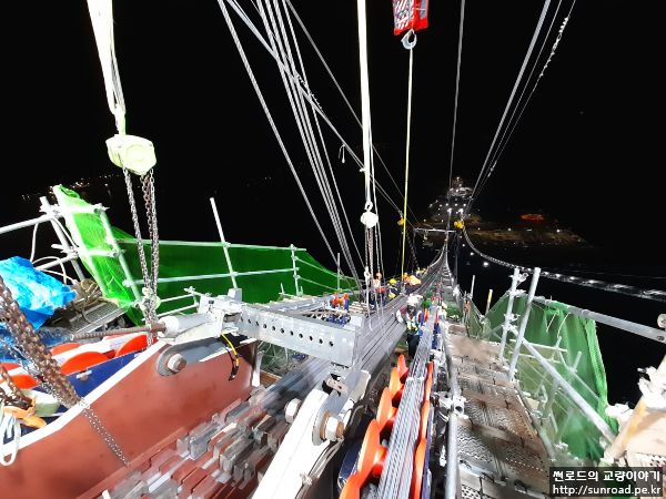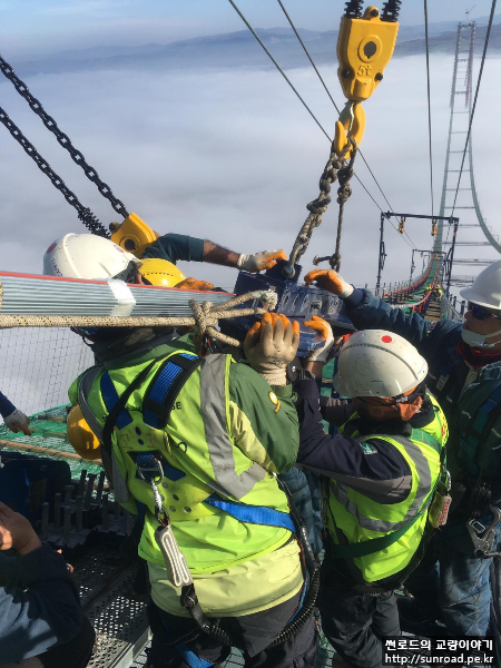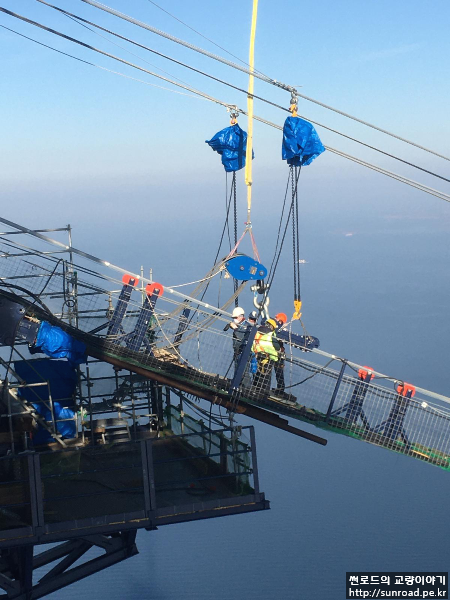 PPWS를 Rope Carrier에 연결 후 Hauling Sysyem을 이용하여 건너편(유럽 측)으로 인출합니다. PPWS Strand는 Catwalk Floor위에 위치한 PPWS Roller위에 놓이며 인출됩니다. 인출 시에는 케이블에 일정 간격으로 Anti-Twist Device를 장착하여 작업자들이 따라가면서 케이블이 꼬이는 것을 방지합니다.