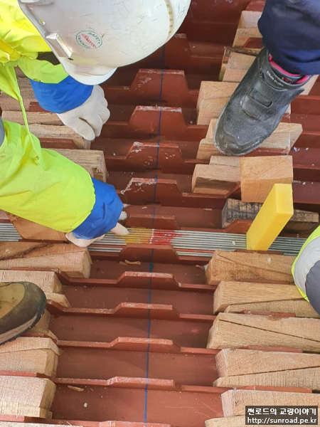가인장을 완료한 후 육각형의 PPWS Strand를 새들 Trough에 넣어 위치시키기 위해 사각형으로 정형합니다. 차낙칼레 교량의 경우 Strand의 새들 통과 구간을 공장에서 사각형으로 미리 정형하여 시공성을 좋게 하였습니다. 아래 사각 정형하는 사진은 일부 흐트러진 Strand를 정형하는 모습으로 대부분은 따로 사각 정형을 하지 않았습니다. 정형이 완료되면 Strand와 새들 중심부의 Marking을 기준으로 Strand를 위치시킵니다. 이와 동시에 PPWS Socket을 앵커리지에 설치합니다.