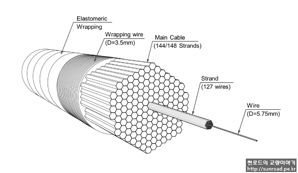 차낙칼레 교량의 메인케이블은 아래 그림과 같이 1960 MPa 강도의 5.75mm 직경 와이어 127개로 이루어진 PPWS Strand 144/148(중앙경간/측경 간) 개로 구성되어 있습니다. 1개 strand길이는 약 4.4km, 무게는 113 ton이며, 완성되는 메인 케이블의 직경은 중앙경간 기준으로 870mm 정도입니다. 교량에 사용되는 메인 케이블의 총중량은 32,000 ton 정도입니다.