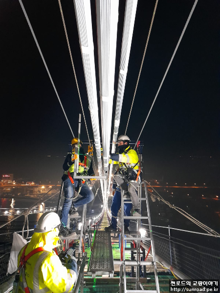 설치를 완료한후 Sag측량을 하여 케이블의 최종 선형을 조정합니다. Sag 측량 결과에 온도 등을 고려하여 조정 값을 결정하게 됩니다. Sag 조정은 아시아 주탑을 고정으로 아시아/유럽 측경간은 앵커리지 정착구에서 유압잭으로 조정하고, 중앙경간 Sag조정은 유럽주탑에서 유압잭을 이용하여 조정합니다.
