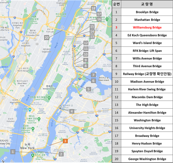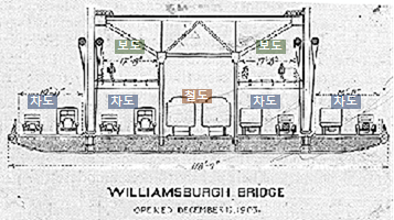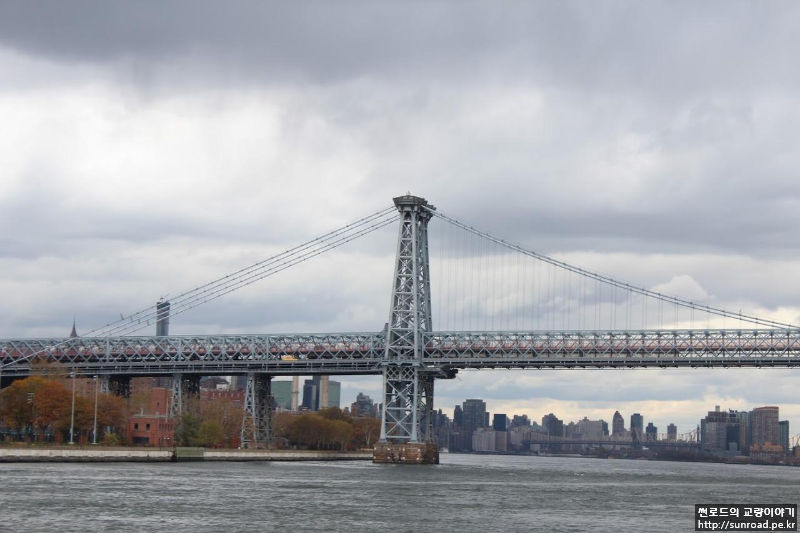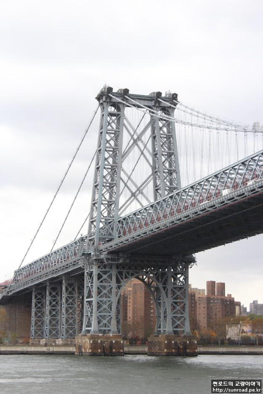 윌리엄스버그 브릿지는 (Williamsburg Bridge)는 뉴욕 이스트 강에 위에 위치하여 맨해튼 동부와 브루클린 지역을 잇는 현수교로 1903년에 완공되었습니다. 교량 연장은7,308 feet (2,227m), 폭 118 feet (36 m)이며 중앙경간은 1,600 feet (490m)의 단경간 현수교로 1924년까지 세계 최장 경간 교량이었습니다.