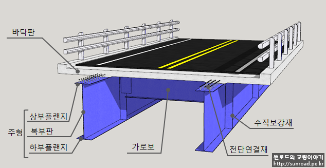플레이트 거더교(Steel Plate Girder Bridge)는 강판형교(鋼板桁橋)라고도 하며 철판으로 I형의 거더를 만들고 그위에 콘크리트 슬래브를 얹은 형태의 교량으로 강 거더교의 가장 기본적인 형식이라고 볼 수 있습니다.