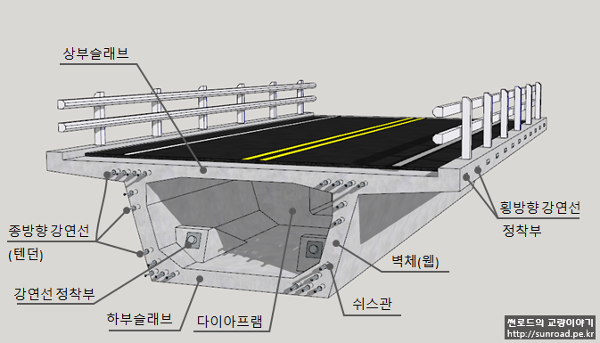 박스거더의 프리스트레스(Prestress)의 도입은 포스트텐션(Post-tensioning) 방법을 사용하며 위의 개요도 및 아래 사진과 같이 박스거더 단면내부에 쉬스관을 배치하고 콘크리트를 타설 후 쉬스관 안에 강연선(텐던, Tendon)을 넣고 정착구에서 유압잭을 이용하여 인장함으로써 거더 단면에 프리스트레스를 도입합니다.