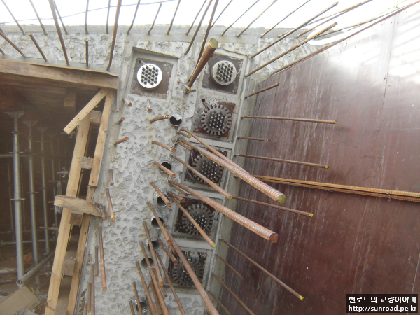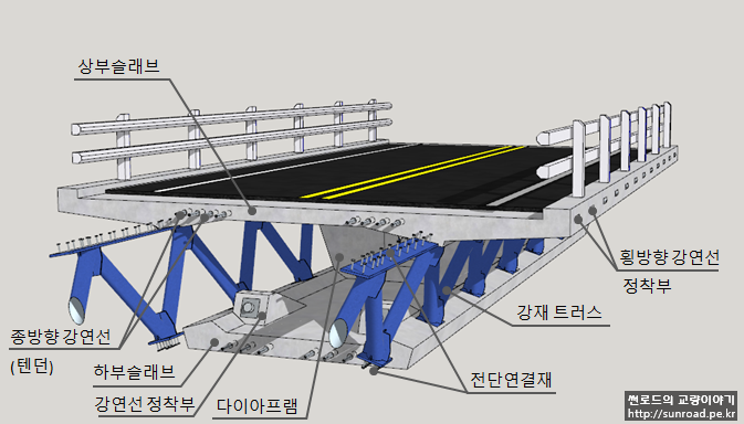 박스거더의 프리스트레스(Prestress)의 도입은 포스트텐션(Post-tensioning) 방법을 사용하며 위의 개요도 및 아래 사진과 같이 박스거더 단면내부에 쉬스관을 배치하고 콘크리트를 타설 후 쉬스관 안에 강연선(텐던, Tendon)을 넣고 정착구에서 유압잭을 이용하여 인장함으로써 거더 단면에 프리스트레스를 도입합니다.