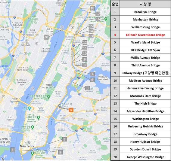 교량명은 퀸즈버러교(Queensboro Bridge)였다가 2011년 3월에 전 뉴욕 시장 Edward Irving Koch를 기리기 위해 공식적으로 Ed Koch Queensboro Bridge로 이름이 변경되었다고 합니다.