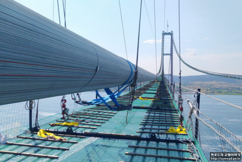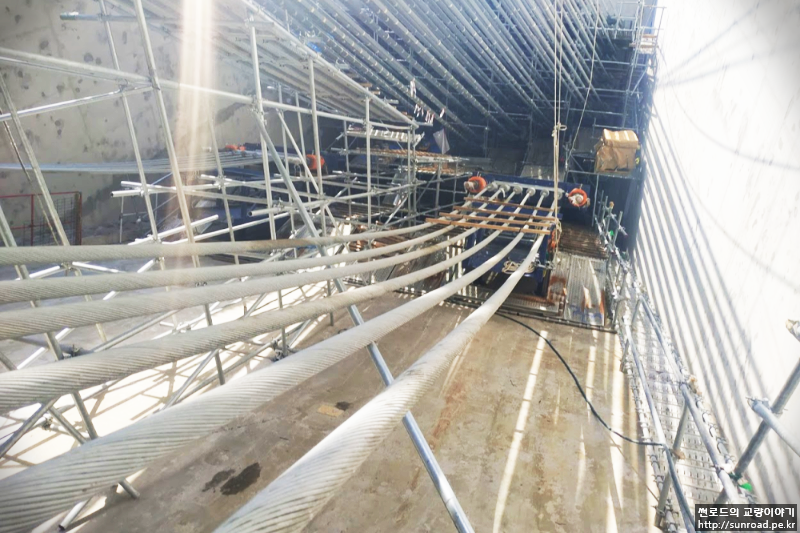 Catwalk Rope Release와 Hanging은 3단계로 실시되었으며 최종적으로 Catwalk Rope는 약 3.5m Release 하였으며, Catwalk Floor는 Sling Belt(슬링벨트)를 이용하여 6m 간격으로 (U-Frame 마다) 메인케이블에 매달았습니다.