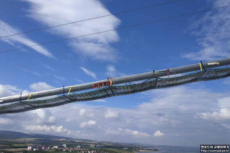 Hauling System 철거 후 Tramway Support Rope(TSR)를 조정합니다. TSR은 메인케이블 가설 시 Gallows Frame의 지지 역할을 하였으며, 행어 클램프 설치시 클램프 및 자재 등을 운반하는 용도로 사용됩니다. 행어 클램프 등 운반 시 TSR의 과도한 처짐이 발생하는 것을 방지하기 위하여 Sag를 상향으로 조정하고 Rope 중앙부에 Tie Down을 설치합니다. TSR의 조정은 아시아 측 주탑을 고정으로 하여 양쪽 앵커리지, 유럽 주탑에서 실시되었으며 조정량은 약 5m 정도입니다. TSR Tie Down은 주탑에서 Guide Beam을 설치한 후 TSR 중앙부로 이동한 후 Tie Down Rope로 메인케이블과 묶어 설치합니다.