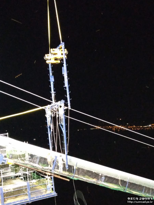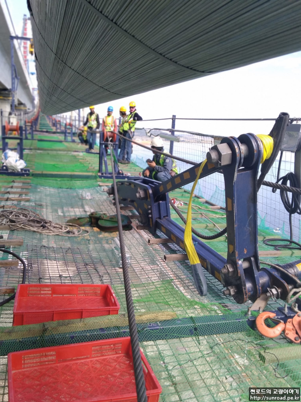 현재 Catwalk의 선형은 메인케이블의 가설을 위한 것으로 향후 보강형 가설로 메인케이블 선형 변경 시 Catwalk Floor와 메인케이블과의 간섭을 피하고 작업성 확보를 위해 Catwalk과 메인케이블과의 적정 간격을 유지할 수 있도록 Catwalk Rope를 Release 하고 메인케이블에 매다는 작업을 실시합니다.