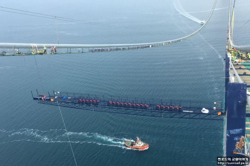 지난 5월 Main Cable 인출 완료 후, 메인케이블 Pre-compaction, Gauge Wire설치, Hauling System 해체, Gallows Frame / Cross Bridge 해체, Tramway Support Rope 조정, Catwalk Rope Release 및 Catwalk Hanging을 완료하고 현재 Main Compaction, 행어 클램프 및 행어 설치 작업을 진행하고 있습니다. 이와 동시에 보강형(Deck) 가설 또한 진행 중입니다. 보강형은 Floating Crane을 이용한 가설(주탑구간 3개 및 측경간 마지막 5개 블럭) 및 Lifting Gantry를 이용한 가설(일반구간)로 진행할 예정이며, 현재 Floating Crane(3,500 ton) 가설을 진행하고 있으며 곧 Lifting Gantry 설치 후 일반구간 가설도 진행할 예정입니다.
