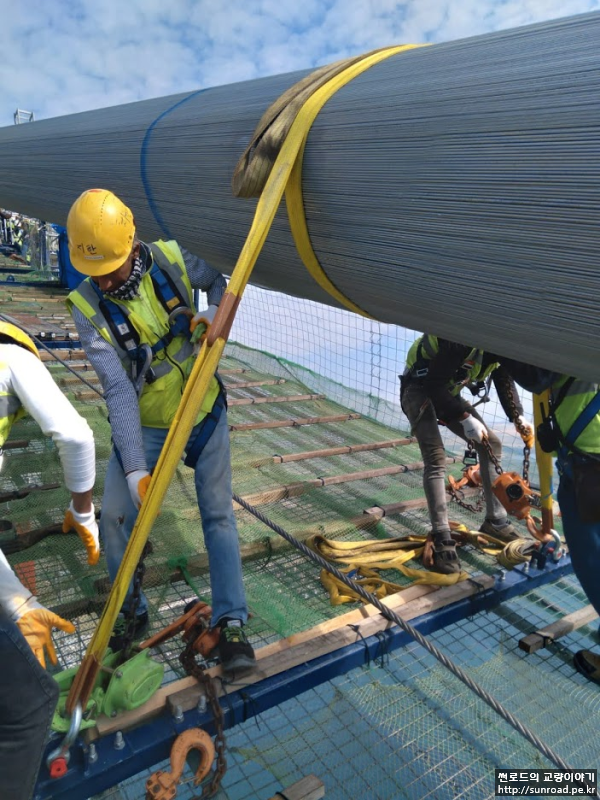 Strand 단위로 배치되어 설치된 메인케이블의 Pre-compaction을 실시하여 메인케이블을 원형으로 정형하고 정형 완료 후 3m 간격으로 Steel Band를 설치합니다. Pre-compaction은 인력으로 나무망치 등을 이용하여 실시하며, Void Ratio(공극률)은 30% 이하로 관리하였습니다.