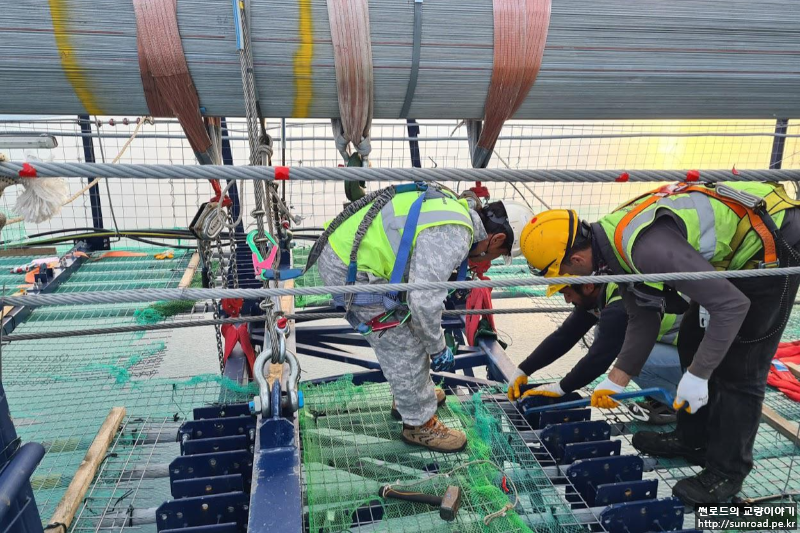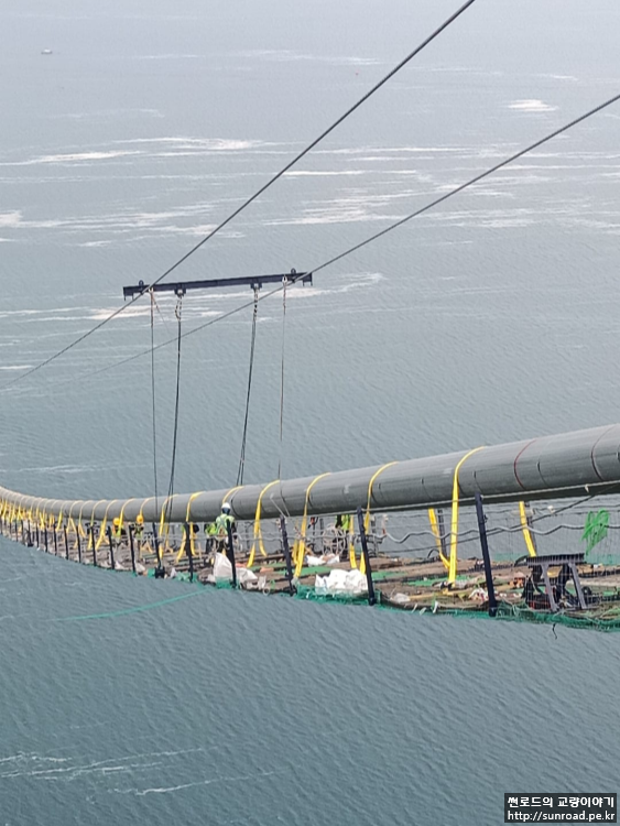 현재 Catwalk의 선형은 메인케이블의 가설을 위한 것으로 향후 보강형 가설로 메인케이블 선형 변경 시 Catwalk Floor와 메인케이블과의 간섭을 피하고 작업성 확보를 위해 Catwalk과 메인케이블과의 적정 간격을 유지할 수 있도록 Catwalk Rope를 Release 하고 메인케이블에 매다는 작업을 실시합니다.