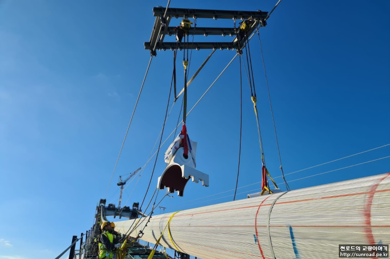 Strand 단위로 배치되어 설치된 메인케이블의 Pre-compaction을 실시하여 메인케이블을 원형으로 정형하고 정형 완료 후 3m 간격으로 Steel Band를 설치합니다. Pre-compaction은 인력으로 나무망치 등을 이용하여 실시하며, Void Ratio(공극률)은 30% 이하로 관리하였습니다.