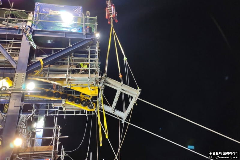 Guage Wire 인출을 마지막으로 Hauling Rope, Gallows Frame 등 Hauling 시스템과 Cross Bridge를 해체합니다. Gallows Frame은 하부 핀 제거 후 탑정 윈치로 주탑으로 끌어올린 후 탑정 크레인으로 해체하였으며(중앙경간), Cross Bridge는 Catwalk과의 연결볼트 제거 후 탑정 윈치를 이용, 수직으로 내려 해체하였습니다.