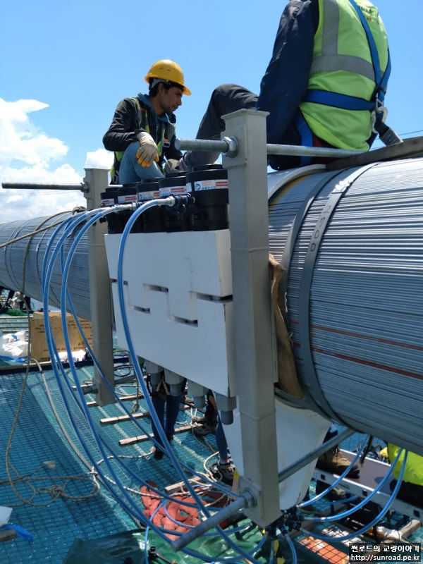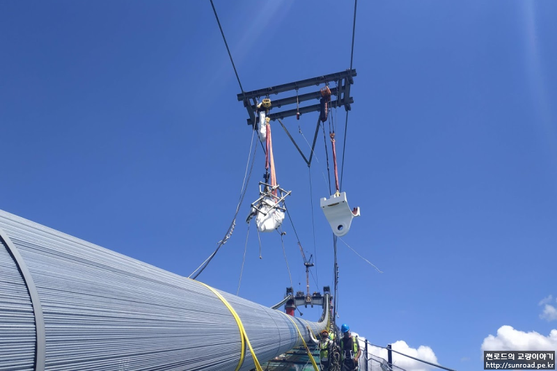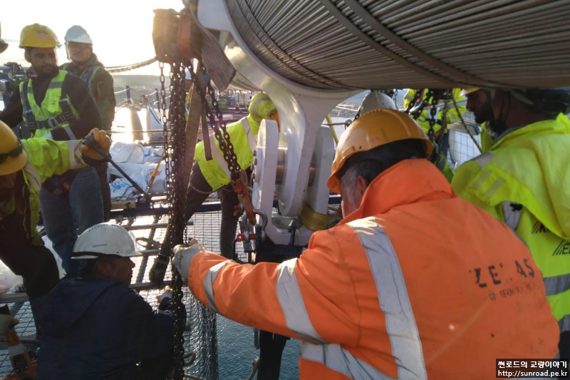 Clamp설치 완료 후 Hanger를 설치합니다. Hanger는 7mm wire 139개(일반구간) 및 151개(주탑 및 측경간)로 구성되어 있으며, 피복을 포함한 직경은 각각 106mm 108mm입니다. Hanger는 바지선으로 이동후 탑정윈치를 이용하여 Clamp까지 인양 후 Anchor Plate에 직경 160mm Pin으로 연결하여 설치합니다.
