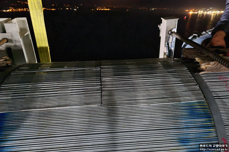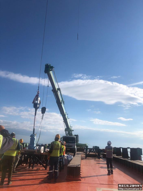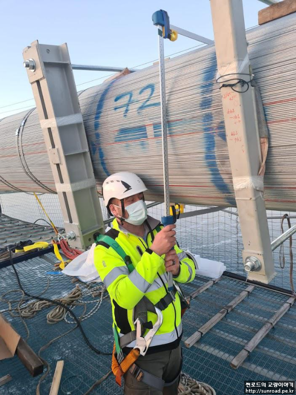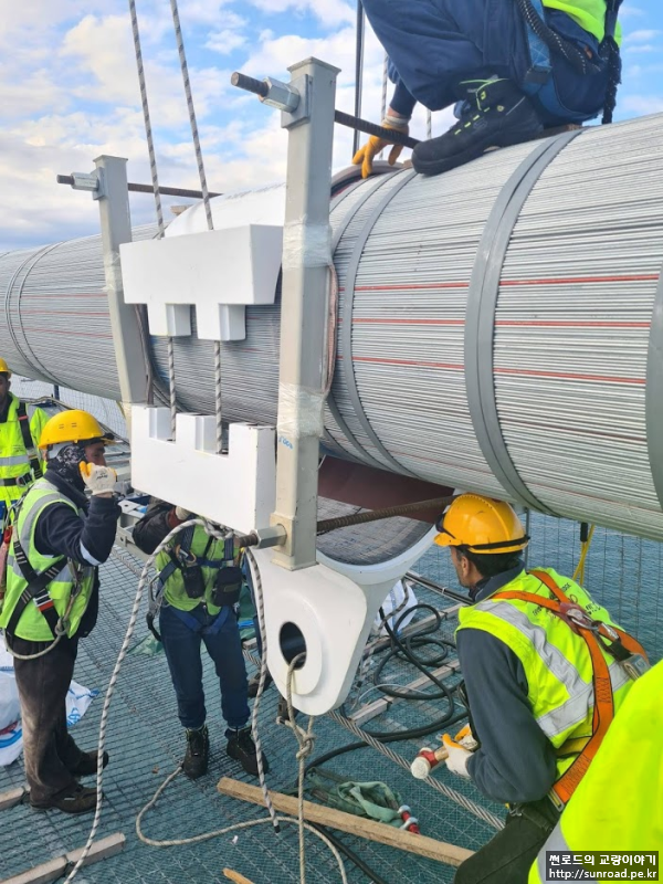 Clamp설치 완료 후 Hanger를 설치합니다. Hanger는 7mm wire 139개(일반구간) 및 151개(주탑 및 측경간)로 구성되어 있으며, 피복을 포함한 직경은 각각 106mm 108mm입니다. Hanger는 바지선으로 이동후 탑정윈치를 이용하여 Clamp까지 인양 후 Anchor Plate에 직경 160mm Pin으로 연결하여 설치합니다.