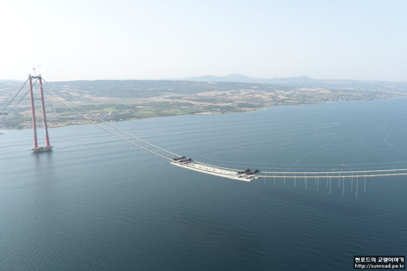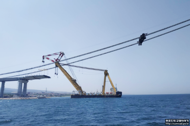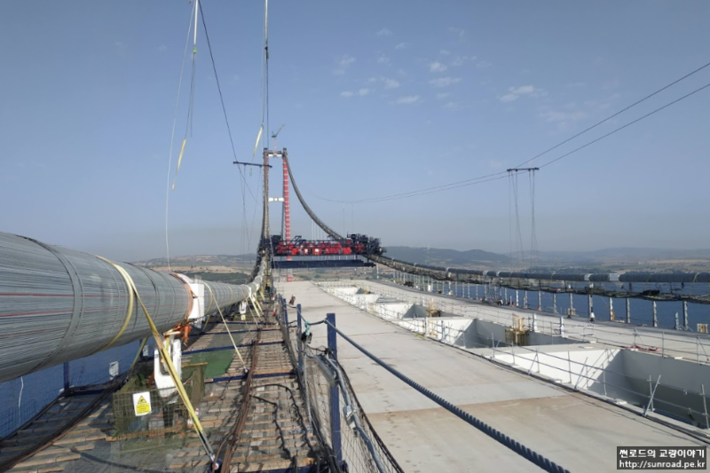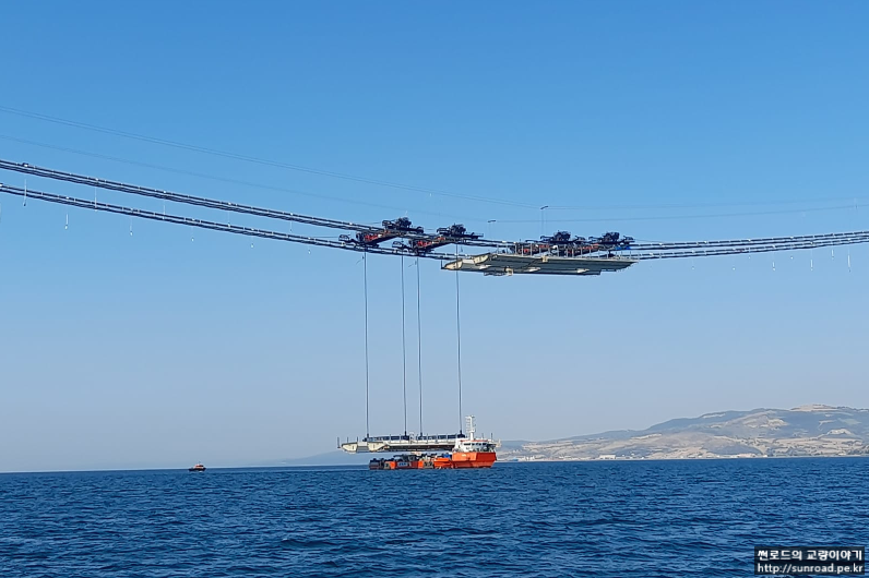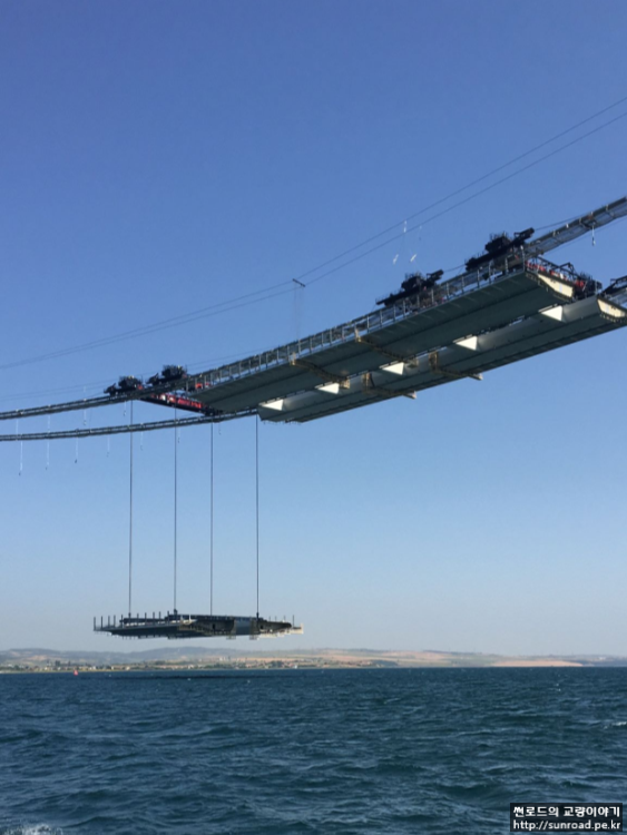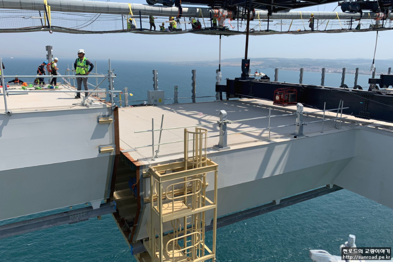 7얼 31일 현재 중앙경간은 4기의 L/G 가설이 완료되었고 이를 이용하여 1개의 Single Block Deck와(24m) 5개의 Mega Block Deck(48m) 가설이 완료되었으며, 측경간은 아시아/유럽 각 1개씩의 L/G가설이 완료되었으며, 4,500 ton Floating Crane(F/C)을 이용하여 아시아/유럽 각 3개/2개의 Deck 가설이 완료되었습니다.
