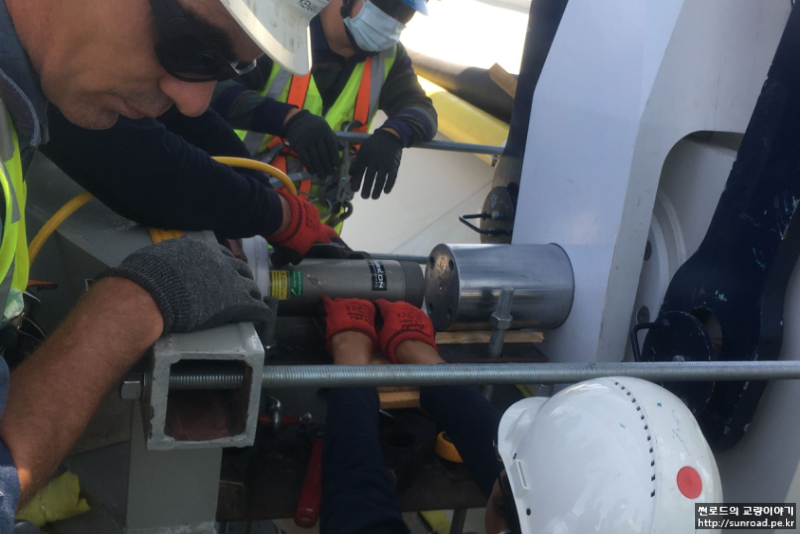 소정의 위치로 데크 인양이 완료되면 데크와 행어 소켓을 핀으로 연결합니다. 행어 Pin의 직경은 160mm 이며 유압잭을 이용하여 삽입후 양단에 Lock Plate을 설치합니다..