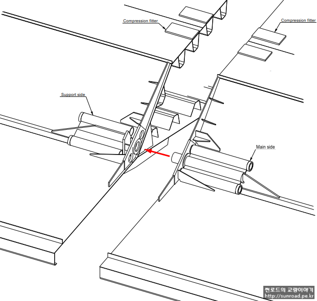 핀설치가 완료되면 데크와 데크의 임시 연결을 실시합니다. 데크와의 연결은 데크 양쪽에 아래 도면과 같이 가이드 핀으로 연결되며 핀 삽입후 강연선을 이용하여 고정합니다.