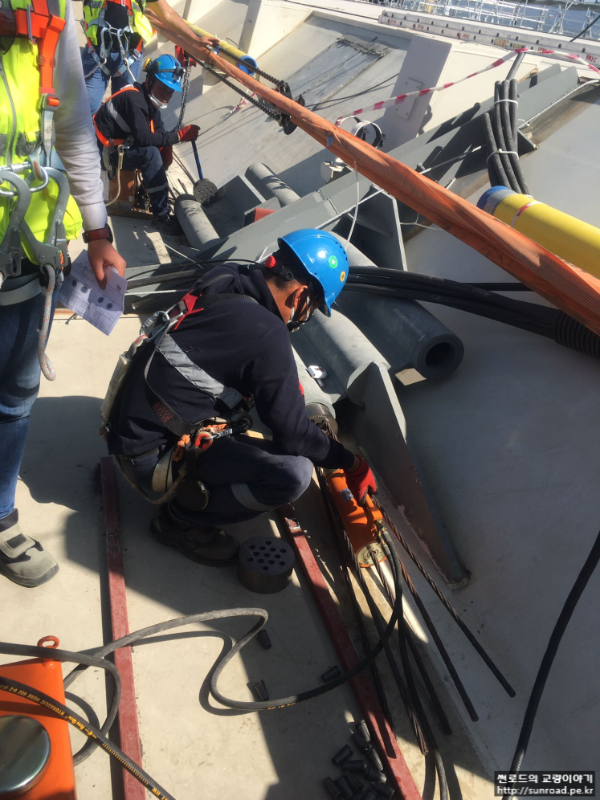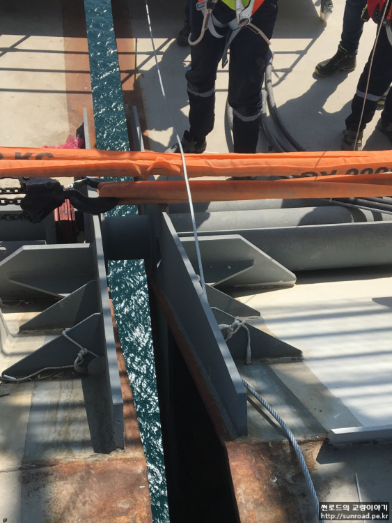 바지선으로 현장으로 이동된 데크는 L/G의 Lifting Beam을 데크 행어 플레이트 Temporary Pin Hole에 연결하여 인양합니다. 인양은 L/G의 Strand Jack을 이용하며 인양속도는 최대 시간당 30m 정도 입니다.